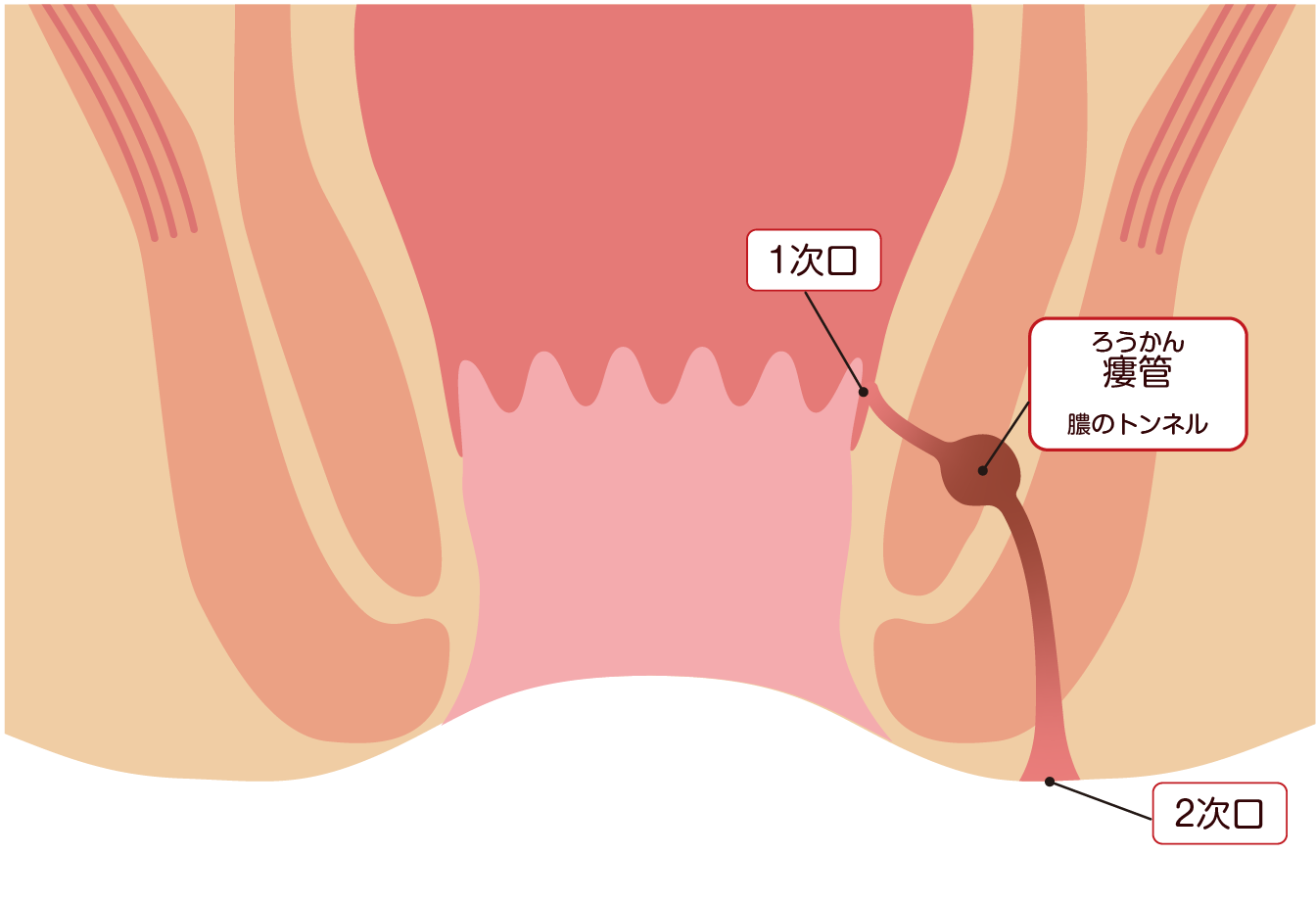 膿の出口(2次口)ができて膿が排出されますが、1次口までつながるトンネル(瘻管)が残ります。